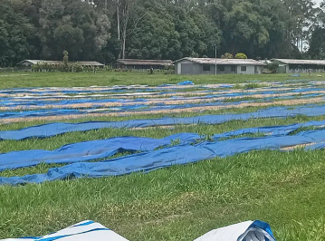 Ripe cherries are handpicked and pulped on the same day using small, hand-operated pulpers at individual farms. The wet parchment is fermented for 36–48 hours in small vats or bags, depending on temperature and humidity. Clean water from local creeks is used to complete the fully washed process, ensuring clarity and a clean cup. Drying typically takes up to a week, weather permitting. While some parchment is still dried on tarps, the cooperative is steadily transitioning to raised drying beds to improve airflow and drying consistency. This lot is classified as Grade B, reflecting uniform bean size and quality, characteristic of well-prepared coffees from Papua New Guinea’s highlands. The combination of careful smallholder processing and gradual drying produces a clean, balanced cup with notes of Nutmeg, Chocolate, and a savory finish.